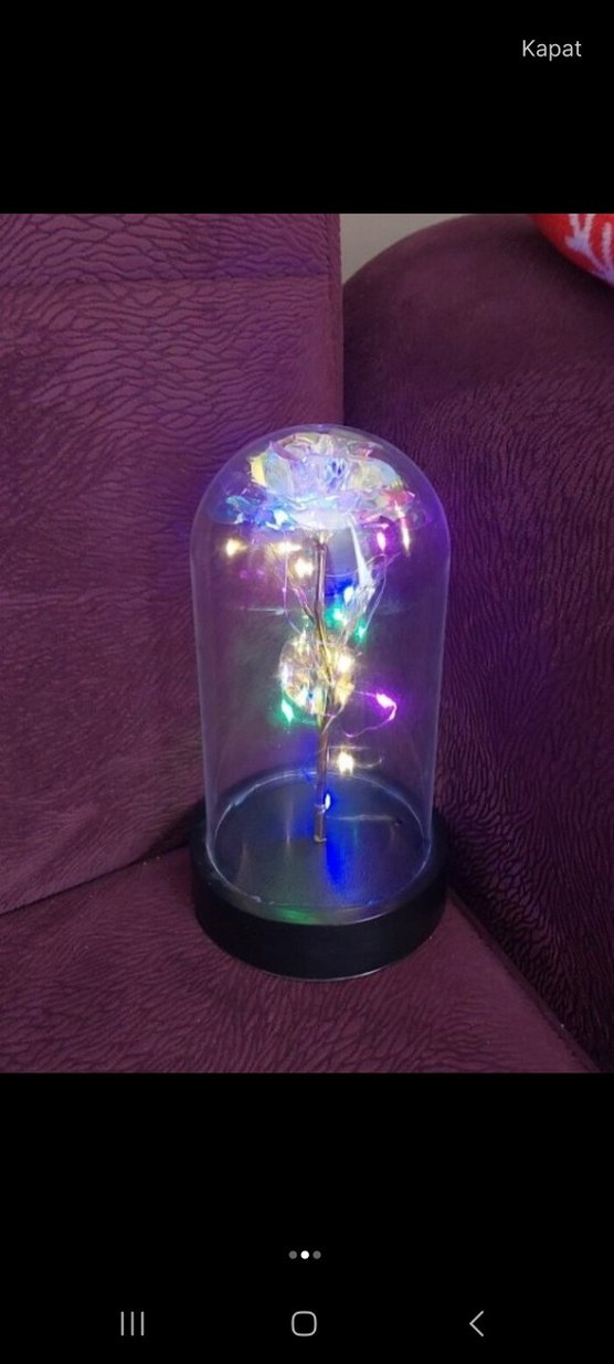 Şeffaf kubbe içinde renkli LED ışıklar ve siyah tabana sahip dekoratif lamba, mekana canlılık katar.