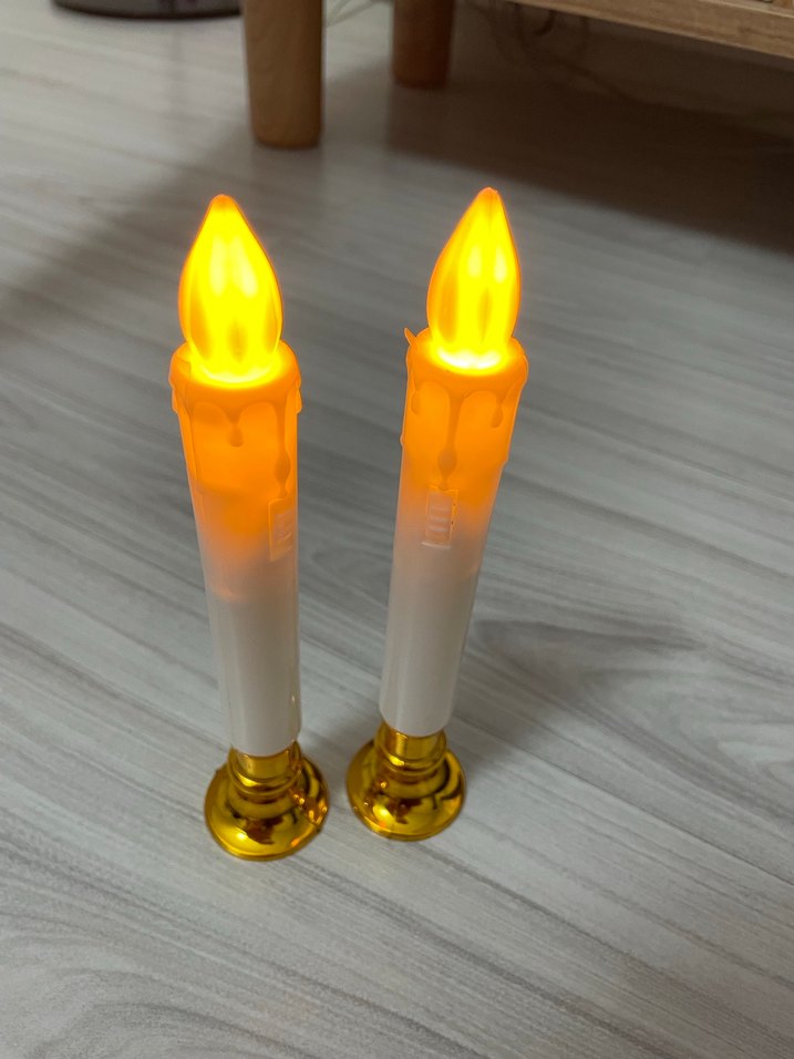Altın renkli tabanlı, renkli LED alevli beyaz mumlardan oluşan set, güvenli ve dekoratif aydınlatma sağlar. ️