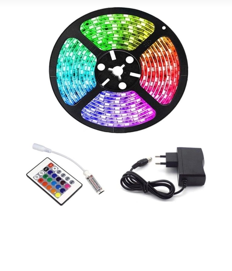 Uzaktan kumandalı ve adaptörlü renkli LED şerit ışık seti. Esnek yapısıyla farklı renk seçenekleri sunar.