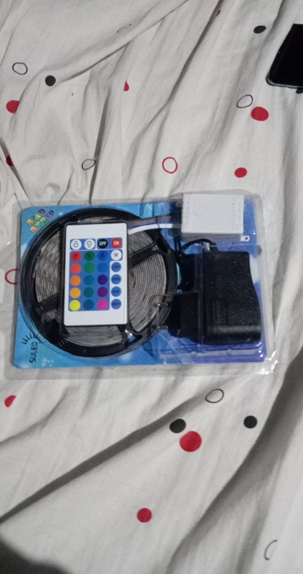 Renkli LED şerit ışık, uzaktan kumanda ve güç adaptörü ile kolay renk ve parlaklık ayarı sağlar.
