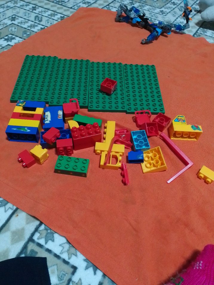 Çeşitli şekil ve boyutlarda renkli Lego blokları, büyük yeşil taban plakası ve çok sayıda canlı parça içerir.