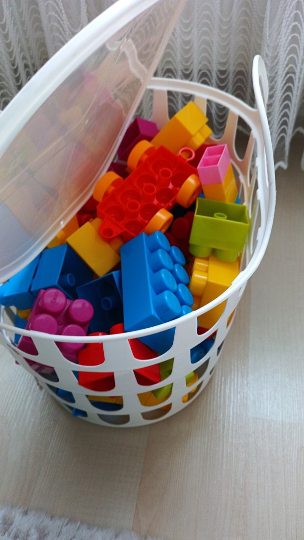 Çeşitli parlak renklerde ve şekillerde Lego blokları, beyaz sepet içinde şeffaf kapakla saklanıyor.