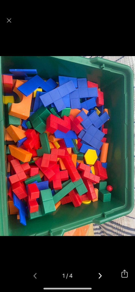 Çeşitli şekillerde renkli Lego blokları yeşil kutuda saklanmaktadır.