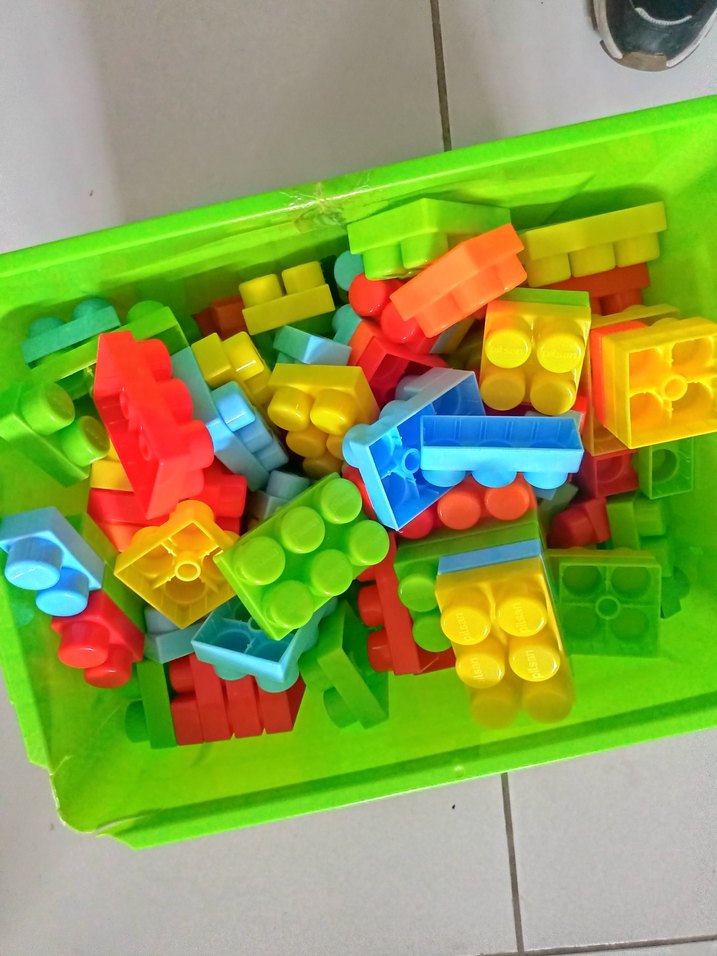 Çeşitli şekil ve boyutlarda renkli Lego blokları yeşil bir kutuda. Yaratıcı oyun için uygun. 214 parça