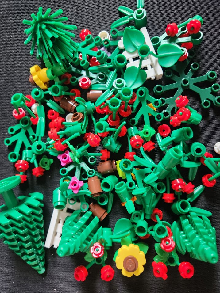 Çeşitli yaprak ve çiçek şekillerine sahip, çok renkli Lego çiçek ve ağaç parçaları.