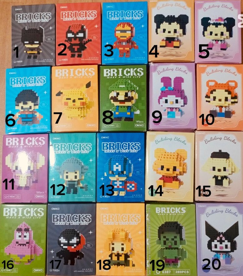 Canlı renklerde, küçük tuğlalardan oluşan çeşitli karakterlerin Lego mini figür setleri. Her set detaylı tasarımlara sahiptir.