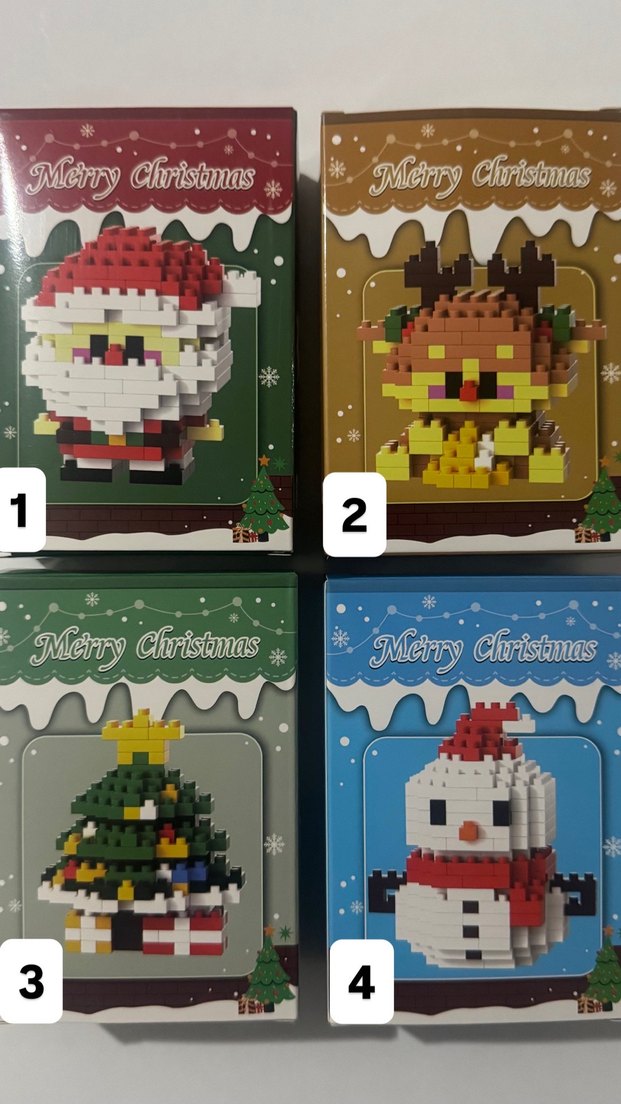 Renkli Lego bloklarından oluşan dört Noel temalı figür: Noel Baba, geyik, yılbaşı ağacı ve kardan adam. Her biri detaylı ve şenlikli.