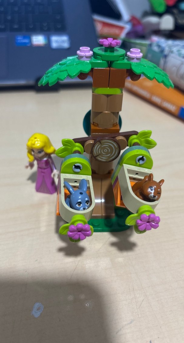 Renkli LEGO setinde, iki asılı yuva içinde küçük hayvan figürleri olan bir palmiye ağacı ve arkada bir prenses figürü bulunur.