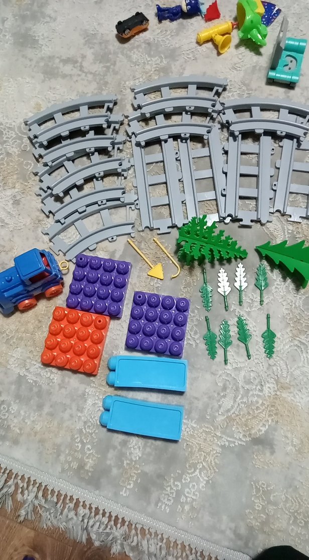 Kavisli tren rayları, bitki parçaları ve farklı şekil ile renkte renkli Lego blokları yer alıyor. Eksiği kırığı çatlağı yoktur. Sorunsuzdur 12 adet büyük ray 4 parça ağaç 8 küçük ağaç iki işaret levhası 5 parça lego ve bir tren legosu