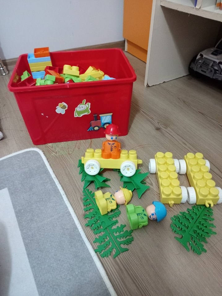 Üç figür, yeşil yaprak parçaları ve kırmızı kutu içeren renkli Lego seti. Temel bloklar ve oyun aksesuarları bulunur. sadece bir tekeri yok