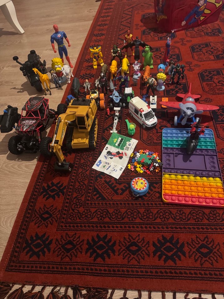 Renkli Lego parçaları, araçlar, süper kahraman figürleri ve pop-it oyuncaklardan oluşan eğlenceli bir set. Canlı çok renkli parçalar ve figürler içerir. ki tane uzaktan kumandalı kepçe ve jip, askerler, kral şakir kahramanları , marvel pop it üzerinde duran helikopter tuşa basıp uçuyor.legolar,hayvanlar ,kahramanlar,gülenyüz topaç,arabalar vs… toplu satıştır