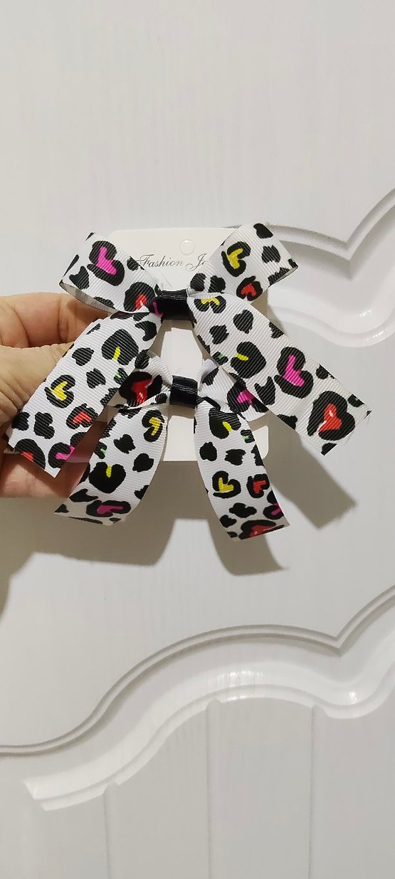 Renkli leopar desenli, fiyonk detaylı saç tokaları. Cesur rock punk tarzıyla çocuk saçlarına eğlenceli bir dokunuş sağlar.