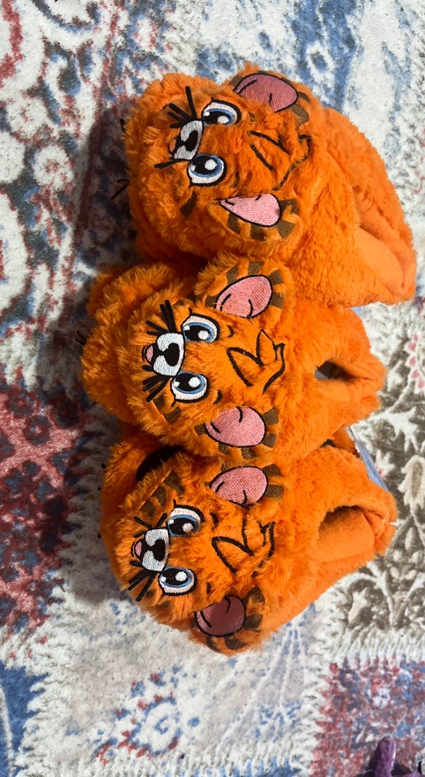 Renkli, turuncu leopar desenli kız ev terliği, yumuşak ve sıcak kumaş ile kürk detayına sahiptir. Bohem, hippie ve retro tarzlar için uygundur.