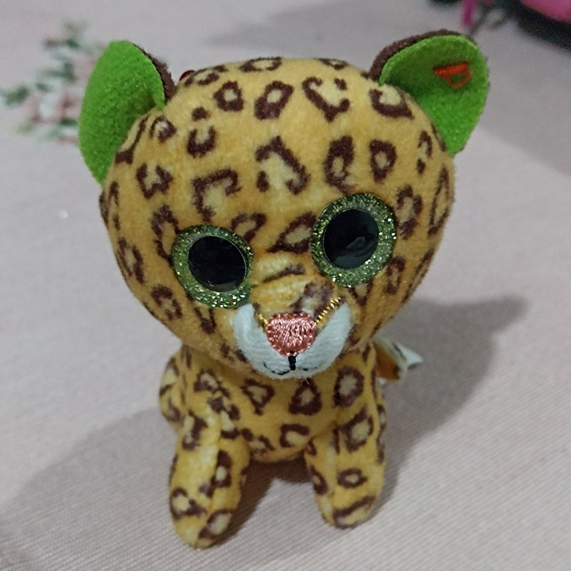 Renkli leopar desenli peluş oyuncak, büyük parıltılı gözlere ve canlı yeşil kulaklara sahiptir. Yumuşak ve sarılmak için uygundur.