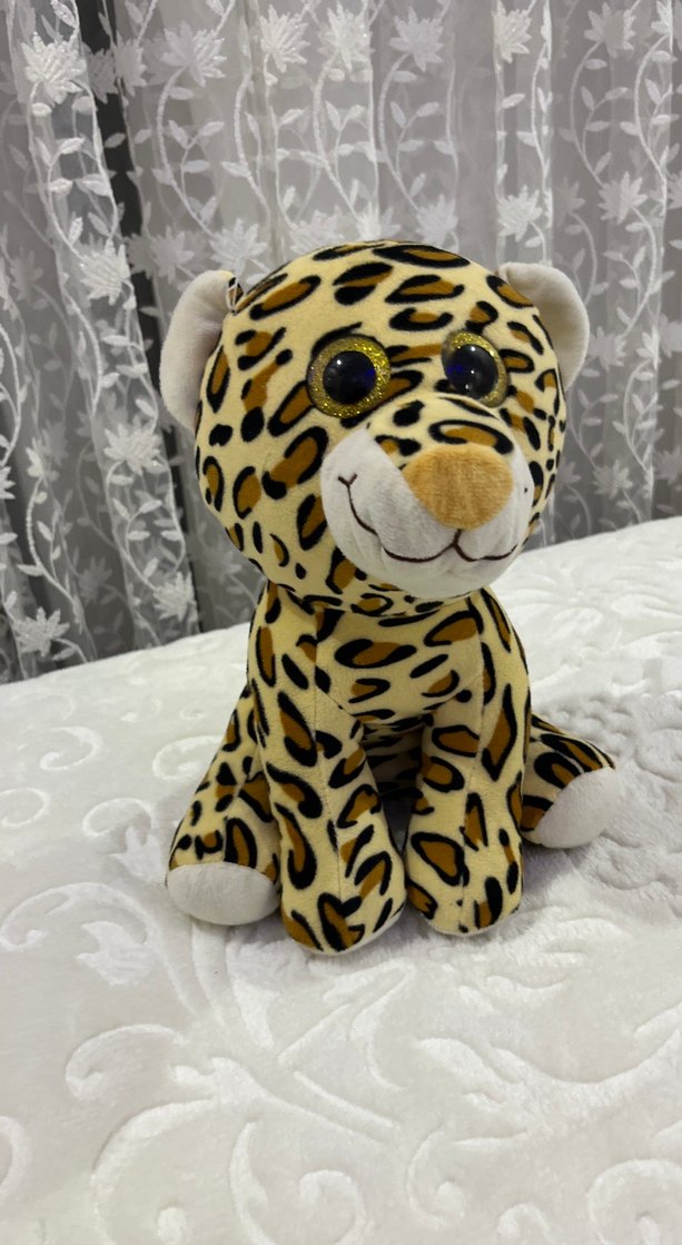 Renkli leopar desenli peluş oyuncak, büyük parlak gözlere ve yumuşak kumaşa sahiptir.