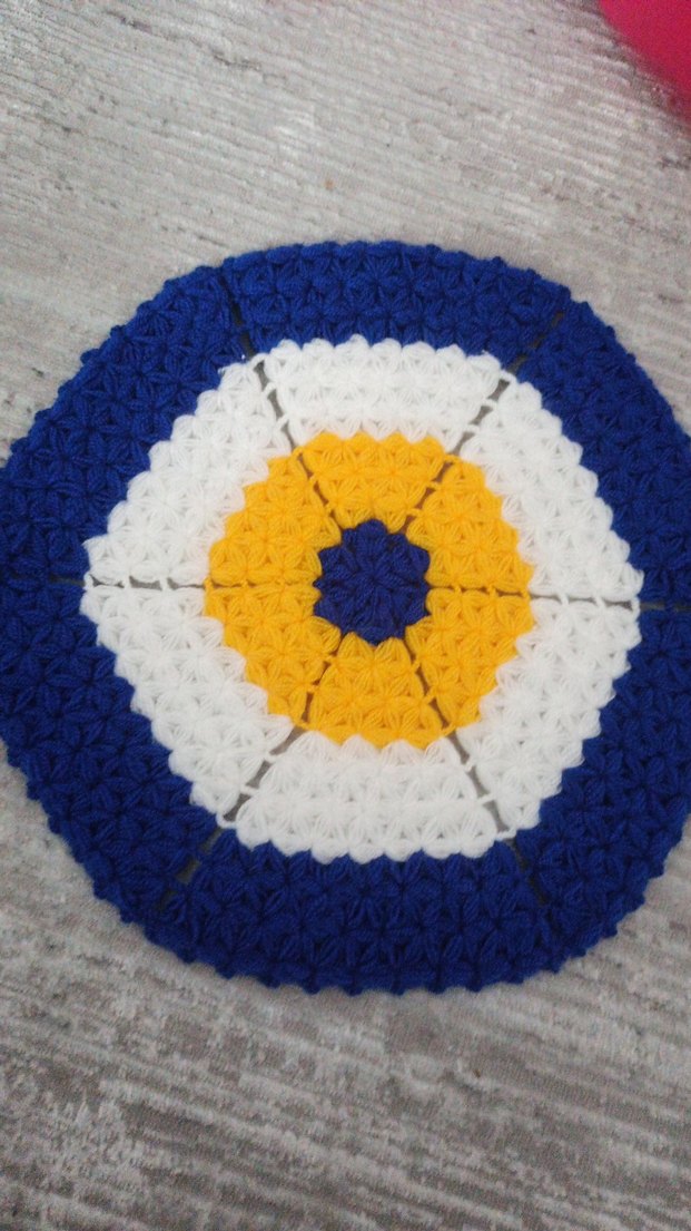 Canlı mavi, beyaz ve sarı desenlere sahip, yumuşak dokulu renkli lif . kendim ördüm
