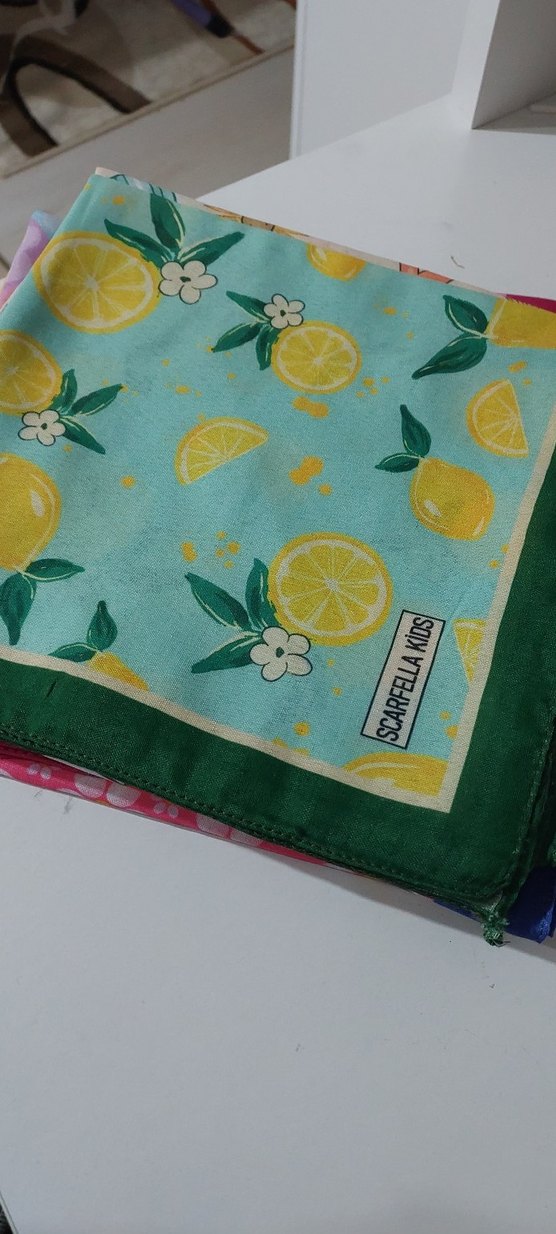Yumuşak sentetik kumaştan, renkli limon desenli ve fırfırlı kenarlara sahip kadın fuları. Vintage ve bohem tarzını yansıtır.