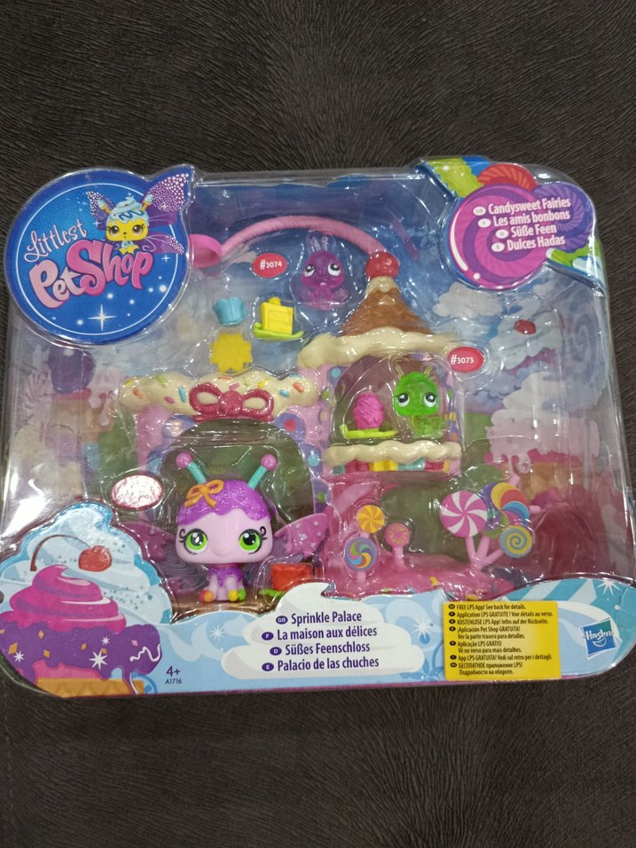 Renkli Littlest Pet Shop oyun seti, şeker temalı aksesuarlar ve iki küçük figür içerir. Tatlı detaylarla dolu eğlenceli bir oyuncak.
