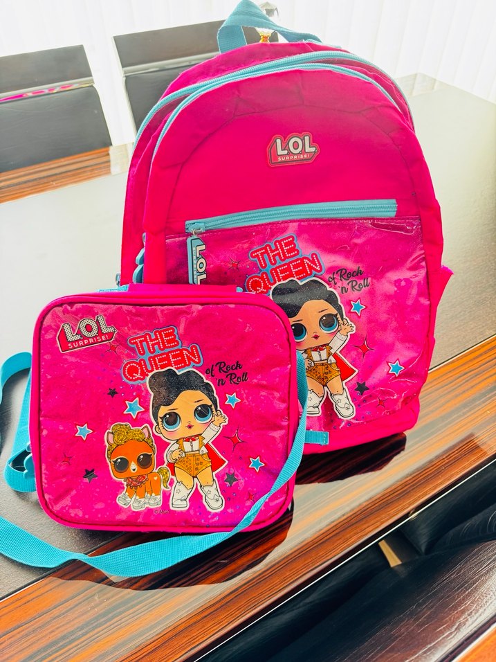 Renkli pembe LOL karakterli okul ve beslenme çantası, "THE QUEEN" yazılı, okul için uygun suluk koyma yerinin dikilmesi lazım