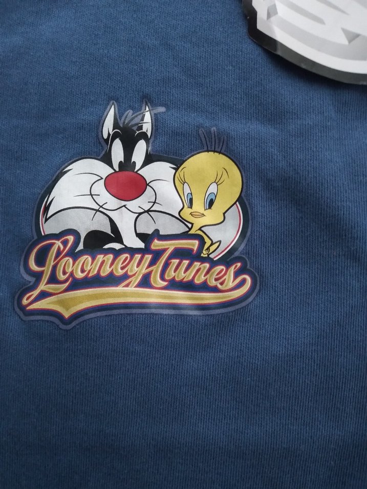 Yumuşak ve sıcak mavi kumaş üzerine basılmış Looney Tunes karakterlerinin yer aldığı renkli çocuk Sylvester ve Tweety figürleri bulunur. ürün orjinal