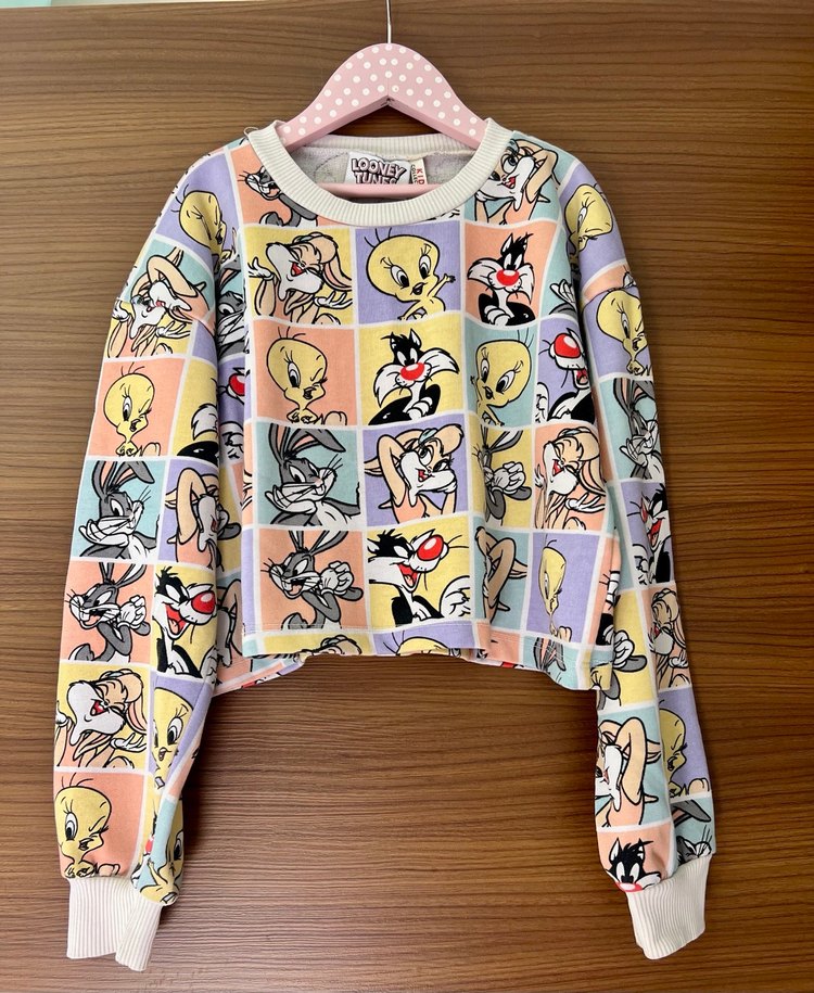 Looney Tunes karakterleri baskılı, uzun kollu, yuvarlak yaka, bol kesim ve yumuşak örgü kumaştan yapılmış renkli kız sweatshirtü.