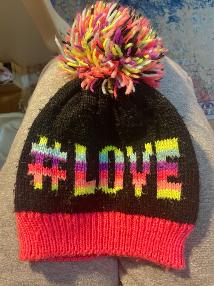 Renkli #LOVE deseni ve çok renkli ponponu ile örme, rahat ve bohem tarzda kadın bere.