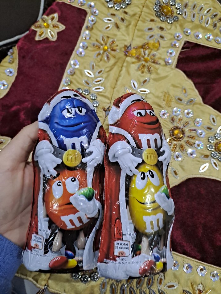 M&M's karakterlerinin Noel temalı kostümlerle renkli figürleri. adet fiyatıdır büyük boy ici çikolata draje doludur