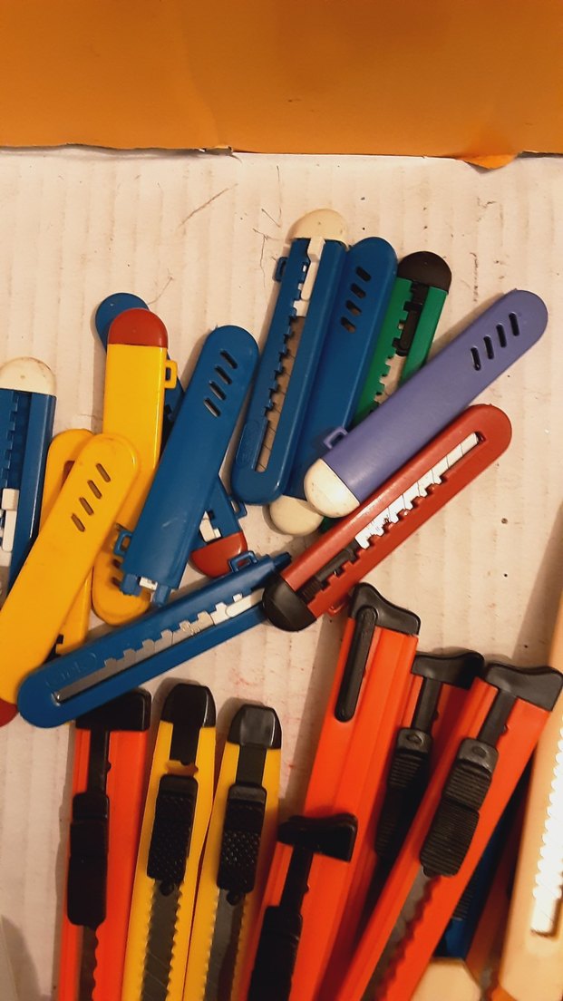 Çeşitli canlı renklerde plastik saplı, açılıp kapanabilen bıçakları olan renkli maket bıçakları seti. ️toplu satılıktır tane tanesi 20 tl