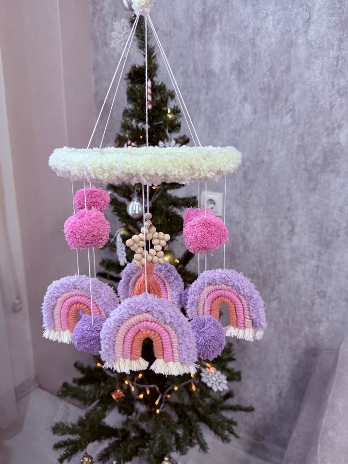 Pastel renklerde gökkuşakları ve ponponlar içeren yumuşak halka üzerinde asılı renkli makrome sarkaç.