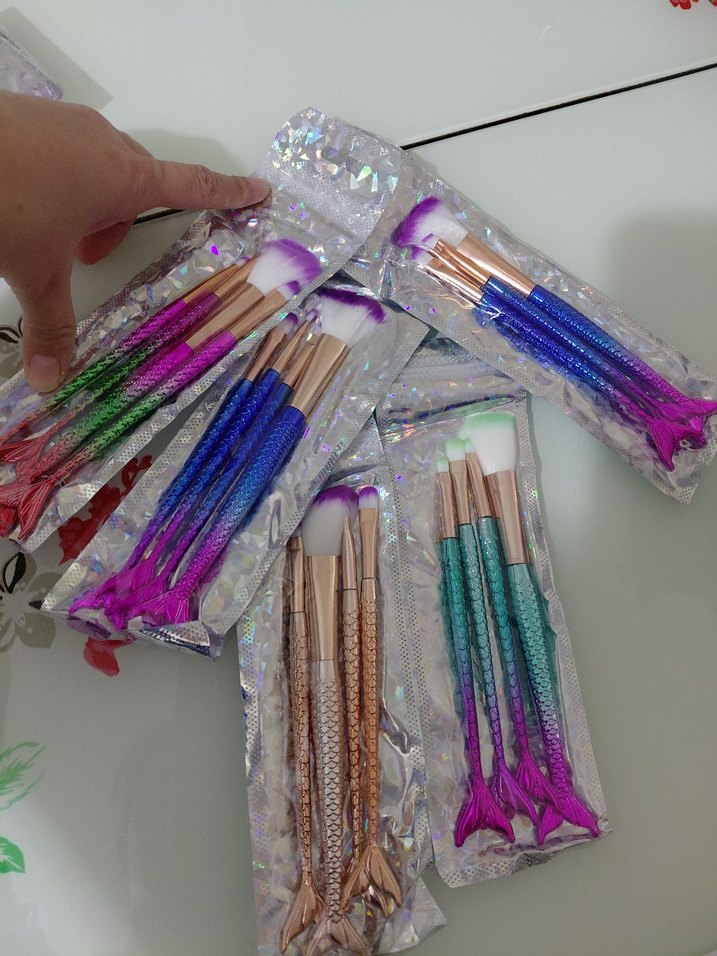 Beş paket renkli makyaj fırçası, hafif ve çok renkli saplara sahip, çeşitli makyaj uygulamaları için yumuşak kıllı fırçalar içerir.