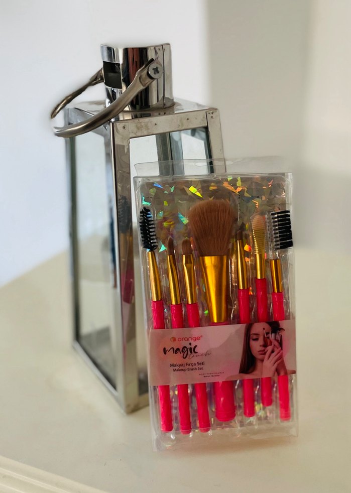Pembe saplı ve altın detaylı çeşitli makyaj fırçalarını içeren renkli makyaj fırça seti. 'Magic' etiketli ve canlı tasarımlı.