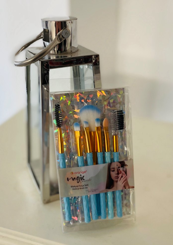 Mavi saplı ve altın detaylı renkli makyaj fırça seti. "Magic" etiketiyle çeşitli fırça türlerini içerir. ️