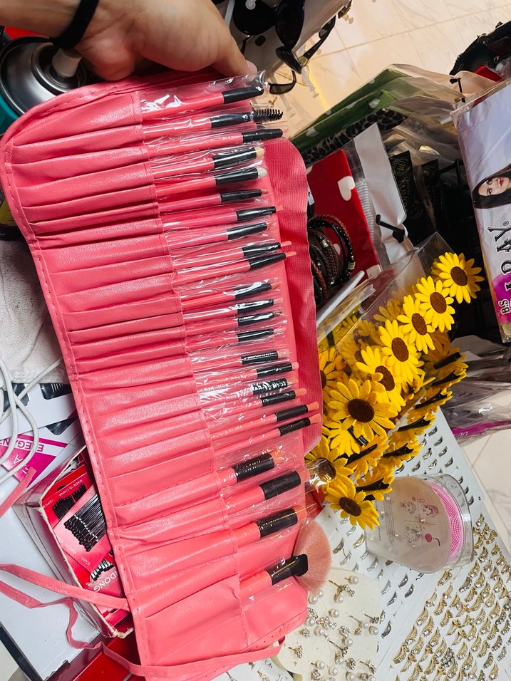 Çeşitli boyut ve şekillerde renkli makyaj fırçaları, pembe katlanabilir kılıf içinde saklanır.