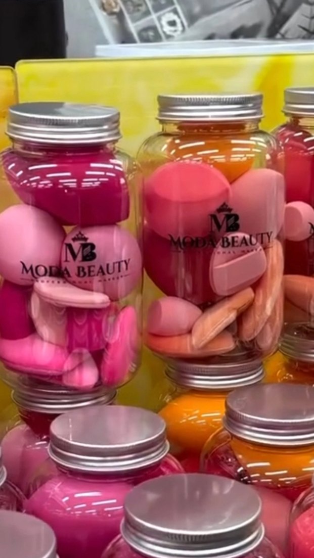 Farklı pembe tonlarında renkli makyaj süngerleri, şeffaf kavanozda ve gümüş kapaklı. Çeşitli şekillerle çok yönlü kullanım sağlar.
