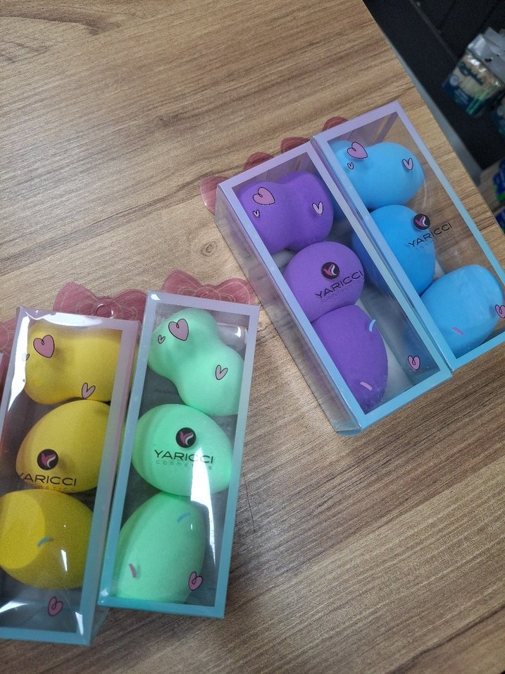 Canlı renklerde çeşitli makyaj sünger setleri, pürüzsüz fondöten uygulaması için uygundur. Her sette farklı renklerde birkaç sünger bulunur.