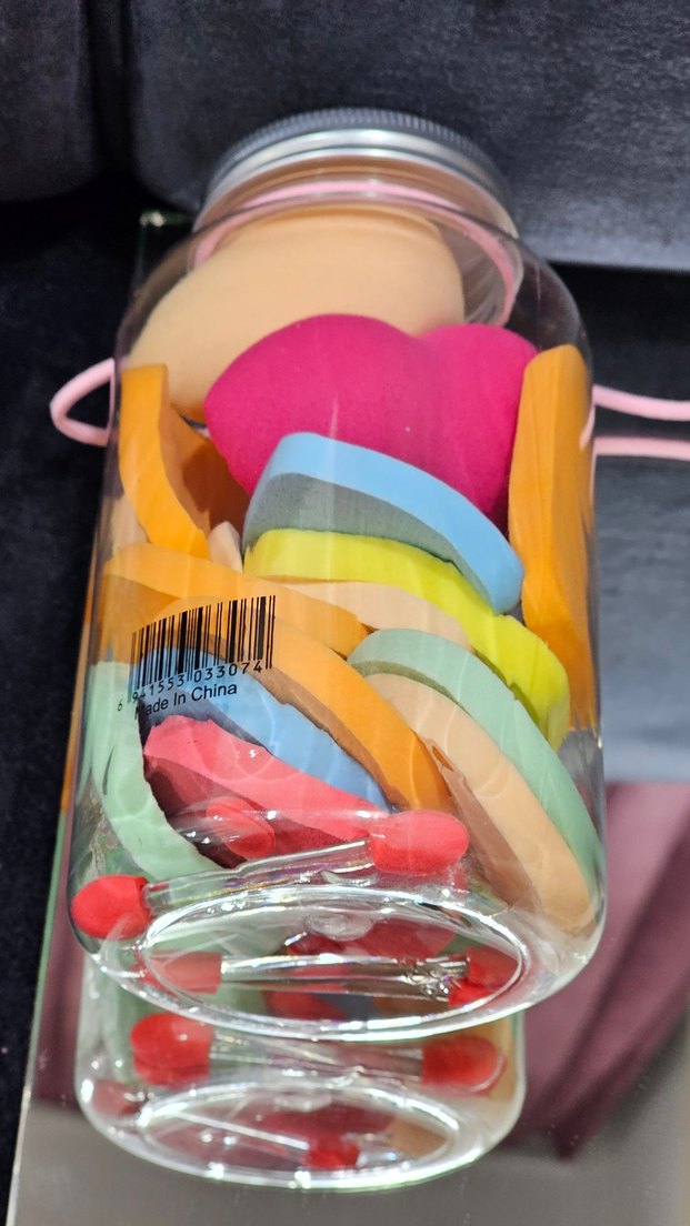 Farklı şekil ve boyutlarda renkli makyaj süngerleri, şeffaf kavanozda saklanmaktadır.