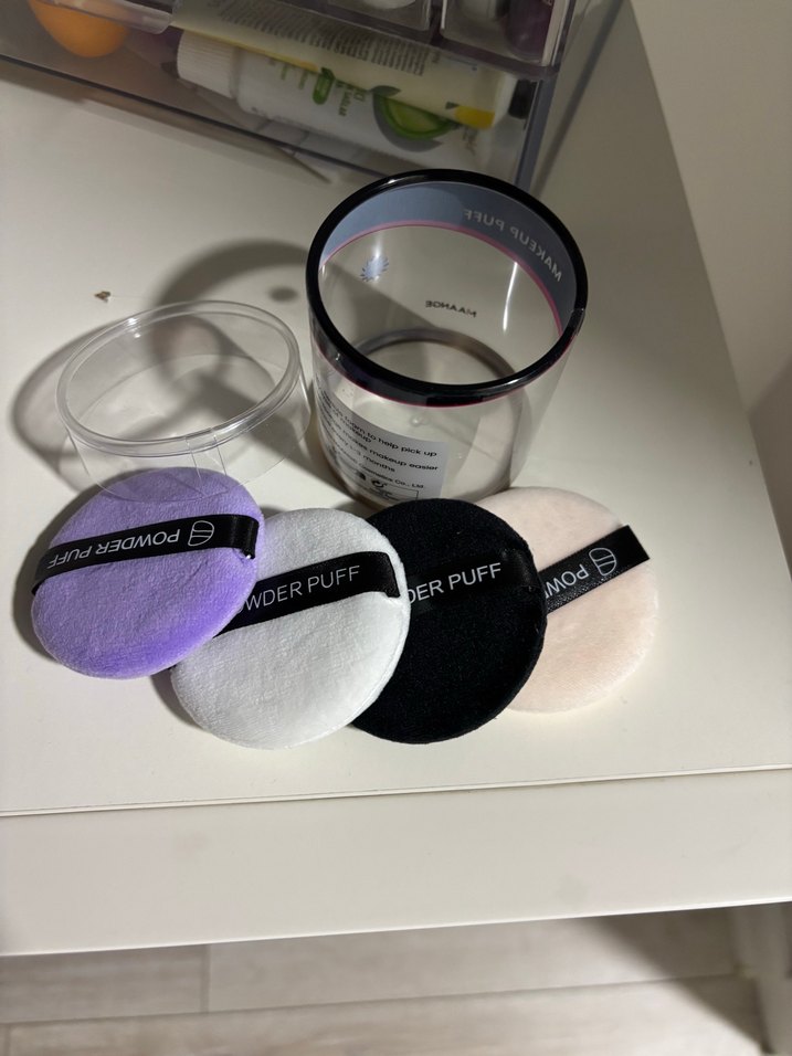 Mor, beyaz, siyah ve açık pembe renklerde dört makyaj süngeri seti, şeffaf plastik kutuda saklanır. Her puff üzerinde 'Powder Puff' yazısı bulunur. Sifir hic kullanilmadi. 4 adet marka temsili