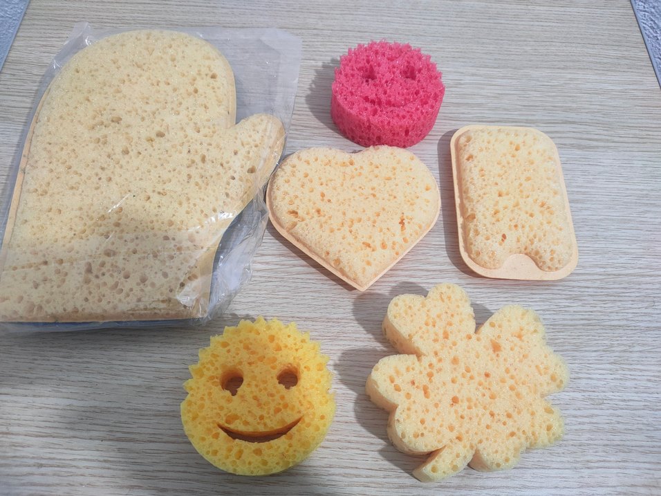 Yumuşak ve gözenekli malzemeden yapılmış, çeşitli şekillerde renkli makyaj süngerleri seti.
