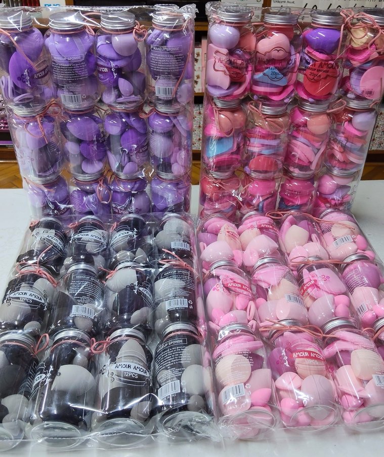 Çeşitli renklerde makyaj süngerleri, şeffaf kutularda paketlenmiştir. Makyajın pürüzsüz ve eşit dağılmasını sağlar.