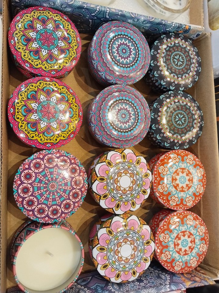 Canlı mandala desenli renkli mum kapaklarıyla dekoratif bir mum seti. ️12 li paket olarak satılır