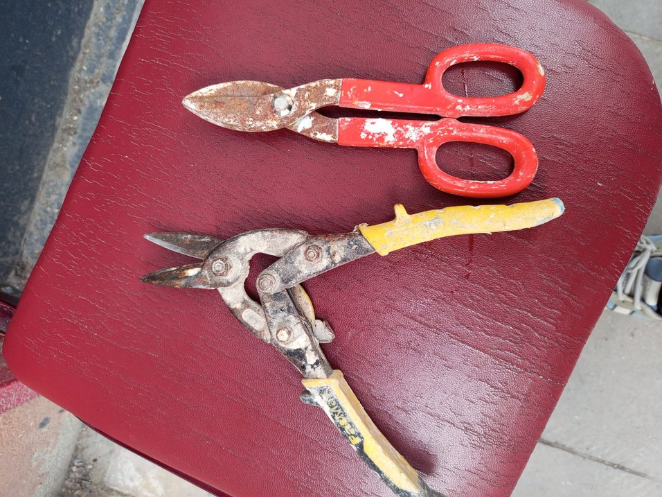 Kırmızı ve sarı saplı, kullanılmış ve paslanmış renkli manikür ve pedikür makasları. ✂️