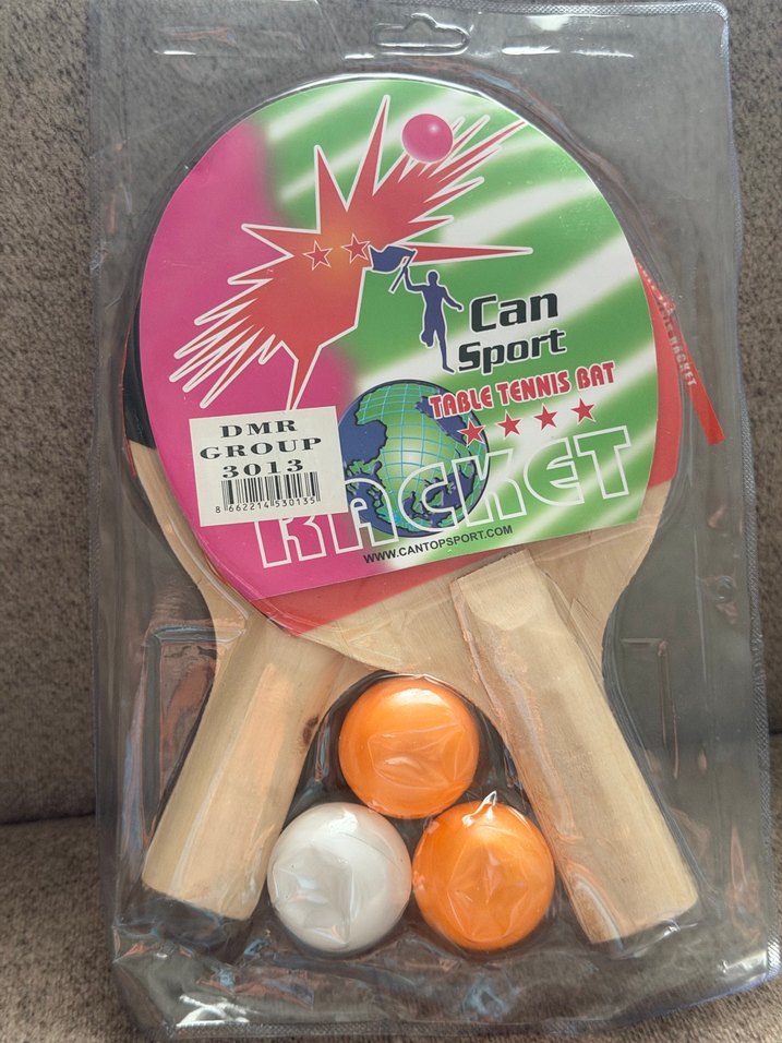 İki adet ahşap saplı renkli masa tenisi raketi ve üç top (turuncu ve beyaz) içeren Can Sport marka set.