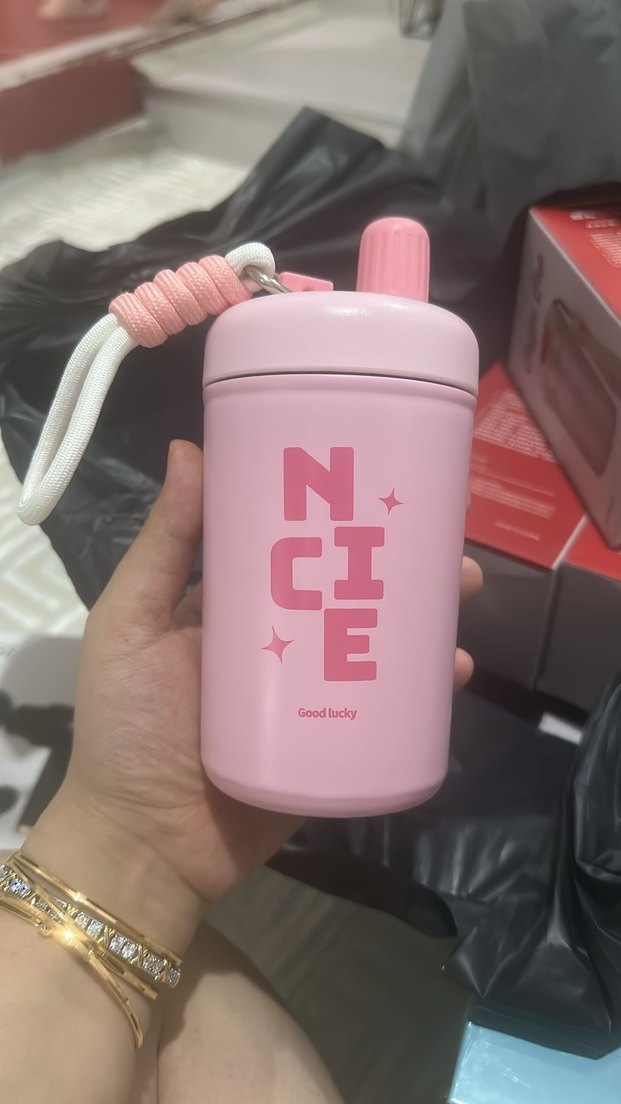 6 saat sıcak ve soğuk tutma özellikli Pastel pembe termos matara, kapaklı ve taşıma ipli. Üzerinde 'NICE' ve 'Good lucky' yazıları bulunur. Sıcak içecekler için uygundur.