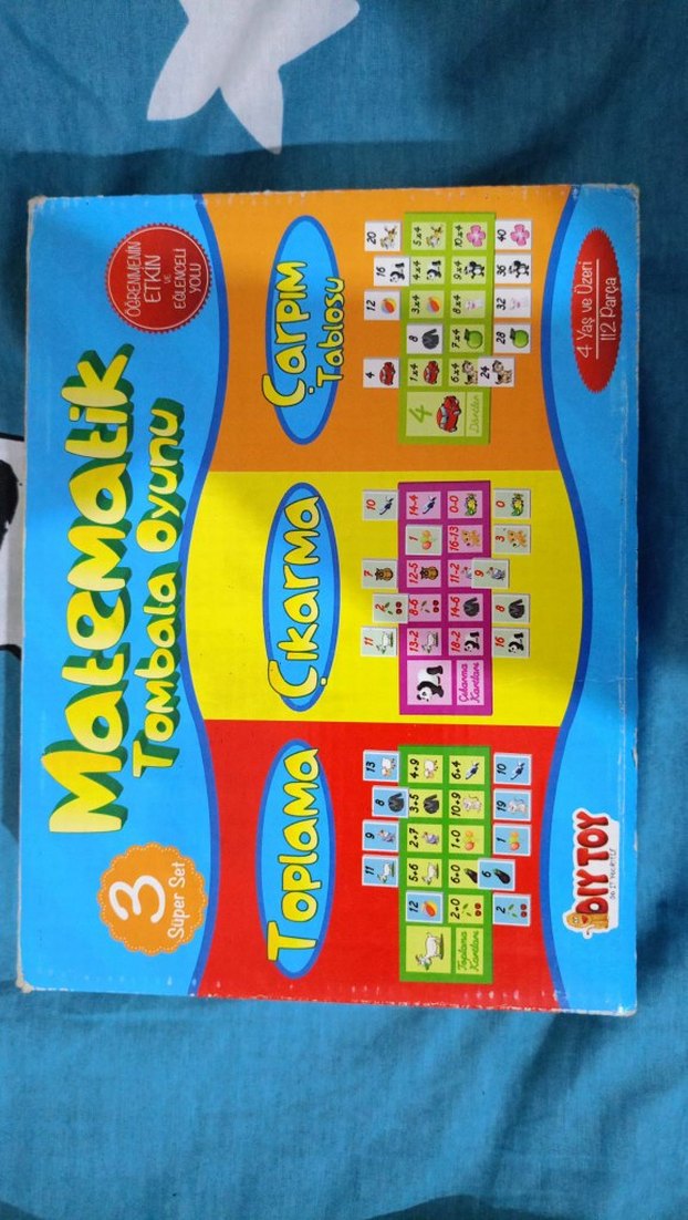 Renkli, toplama, çıkarma ve çarpma tabloları içeren 800 parçalı matematik tombala oyunu seti.