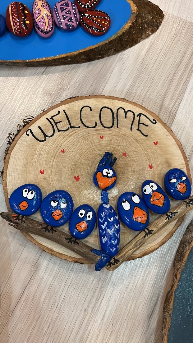Doğal ahşap üzerine "WELCOME" yazılı, renkli mavi kuş figürlü dekoratif ürün. Canlı ve neşeli tasarım.