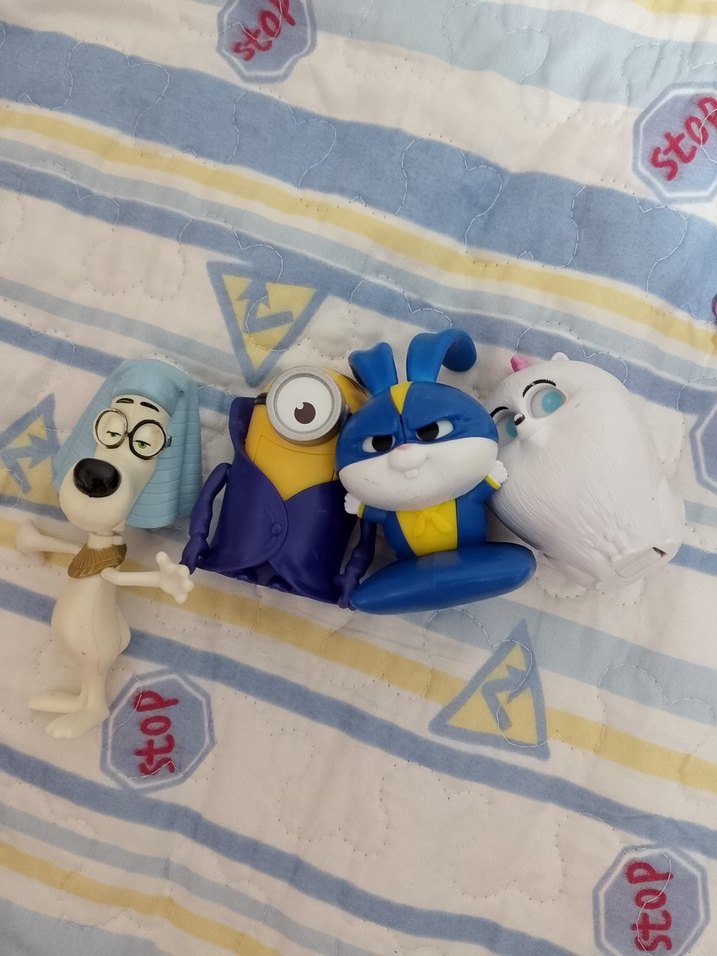 Farklı ifadeler ve pozlarla çeşitli karakterleri gösteren renkli mavi aksiyon figürleri. Koleksiyoncular için uygun.