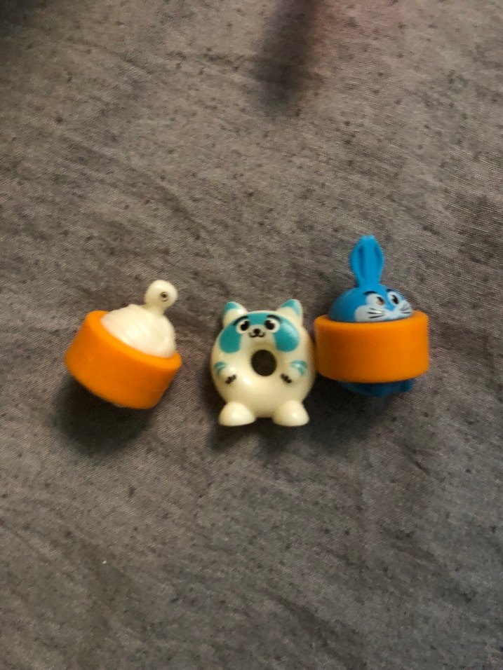 Mavi tavşan, beyaz-mavi figür ve turuncu tabanlı küçük figürden oluşan renkli aksiyon figürleri seti.