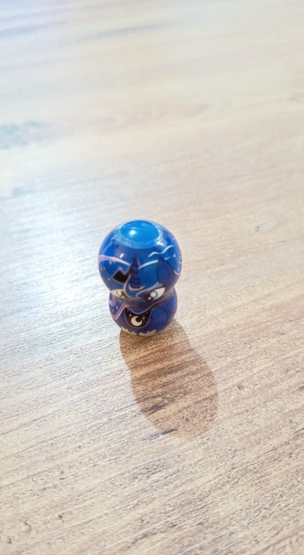 Renkli ve mavi tonlarında, detaylı yüz ifadelerine sahip aksiyon figürü, ahşap yüzey üzerinde duruyor.