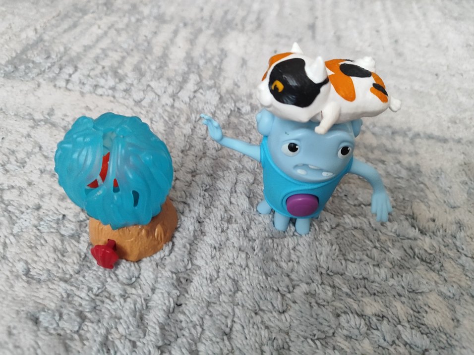 Üzerinde küçük bir kedi figürü bulunan renkli mavi aksiyon figürü. Yuvarlak mor düğmeli ve ifade dolu gözlere sahip.