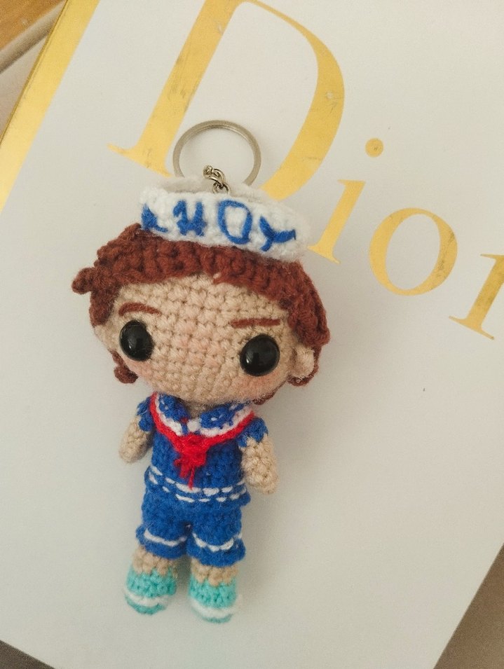 Renkli mavi kıyafetli, detaylı işçilikle hazırlanmış amigurumi bebek anahtarlık.